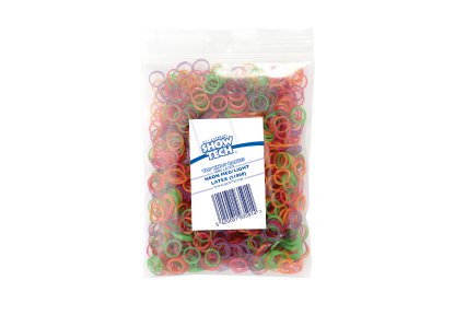 These light, latex bands also measure 8 mm in diameter but are much thinner and more flexible than our regular top knot bands and will not to damage the coat. Available in bags 1000 pieces in mixed, neon colours.